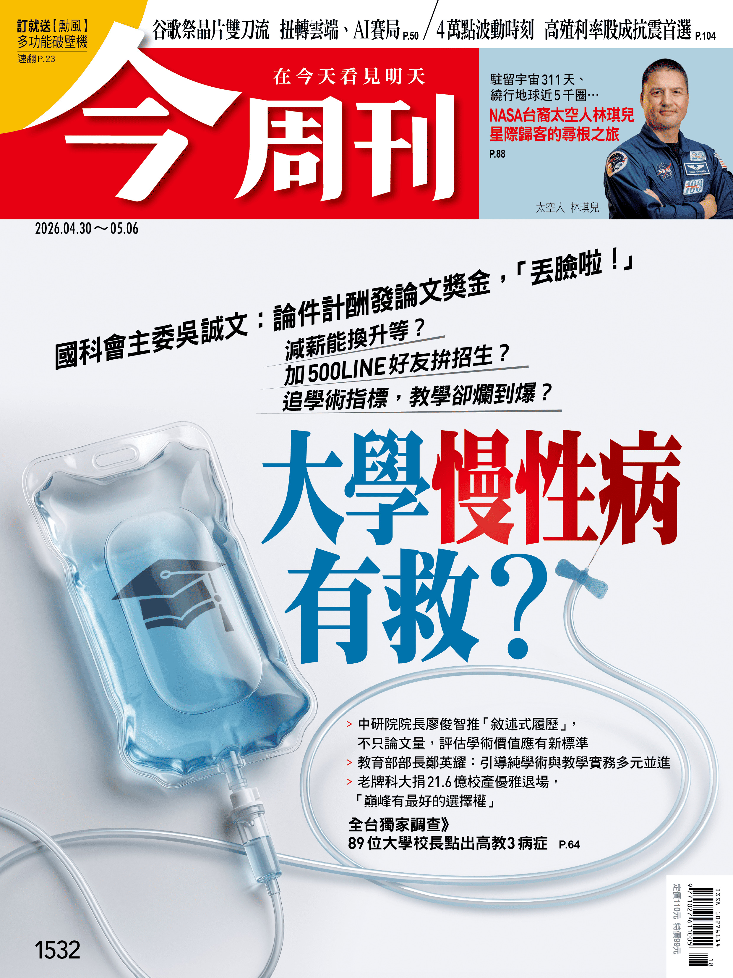 大學「慢性病」有救? 國科會主委吳誠文:論件計酬發論文獎金,丟臉啦 減薪能換升等?加500LINE好友拚招生?追學術指標,教學卻爛到爆? 中研院院長廖俊智推「敘述式履歷」,不只論文量,評估學術價值應有新標準 老牌科大捐21.6億校產優雅退場,「巔峰有最好的選擇權」 全台獨家調查》89位大學校長點出高教3病症 駐留宇宙311天、繞行地球近5千圈⋯ NASA台裔太空人林琪兒 星際歸客的尋根之旅 谷歌祭晶片雙刀流 扭轉雲端、AI賽局 4萬點波動時刻 高殖利率股成抗震首選