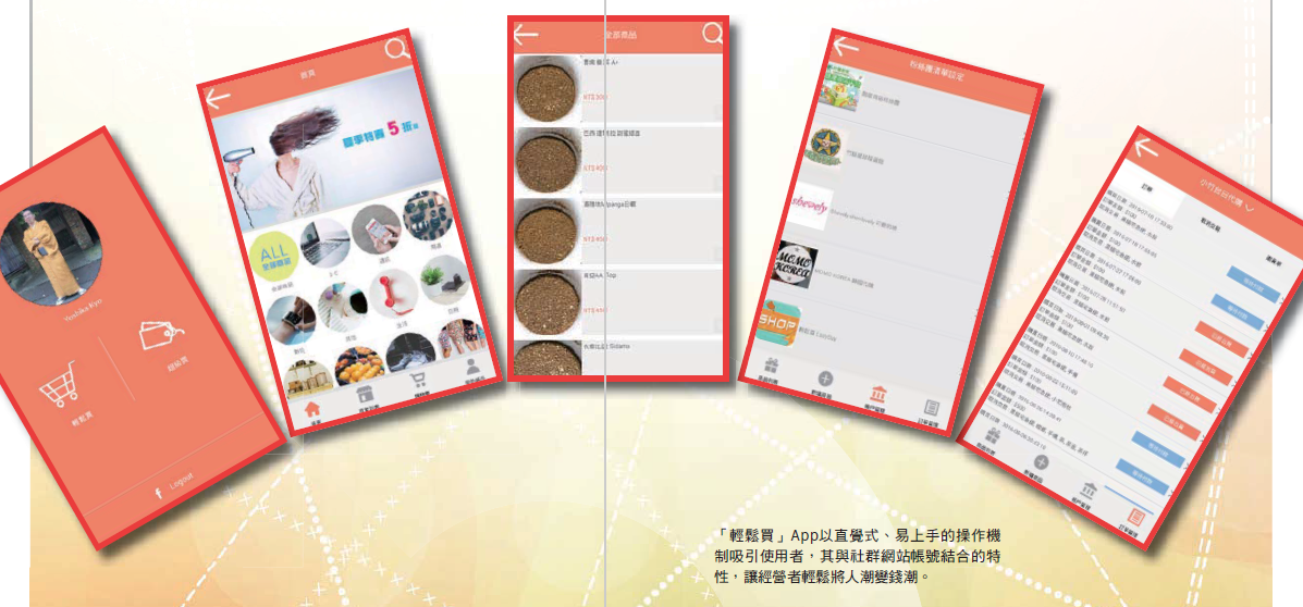 負責人許芳嘉進一步解釋,「輕鬆買」是一個賣家完全免費的網購平台,舉凡食、衣、住、行、育樂甚至虛擬課程,都可以透過這個平台交易,買家和賣家只要在Google Play和Apple Store商店下載「輕鬆買」App,利用FB帳號登入,即可輕鬆網購,賣家如果有多個粉絲頁,還可建立各自獨立的商店直接銷售,只要透過ATM轉帳即可完成交易付款,如需要第三方金流,則可以透過簡易小額月租的方式隨租隨用,目前內建智付寶、Paypal、台灣里等金流服務,物流方式則包含店家宅配、超商取貨等。