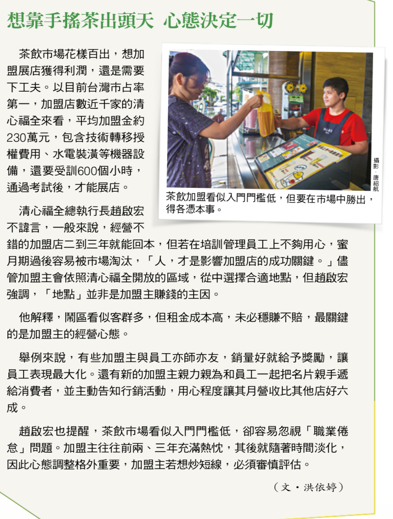 除了既有的老字號品牌,連藝人和企業大老闆都不約而同紛紛搶進布局。藝人納豆投資的手搖茶品牌「良辰吉時」,今年成立以來陸續展店約十家;中租控股總裁辜仲立旗下的中租租車,八月也和薡茶策略聯盟,準備在旗下租車與成旅晶贊飯店門市開手搖茶店中店,並且最快明年上半年,就可能以「總裁茶」的自有品牌,進軍中租東協總部所在的泰國等海外市場。