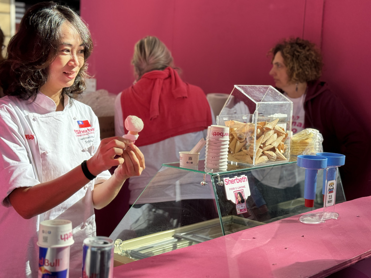 ▲ 義大利西西里島「Sherbeth Festival」國際冰淇淋節世界大賽現場,宛如一場冰淇淋嘉年華。各隊除推出對外販售的公開口味外,另準備作為評審品評的參賽祕密口味。(照片提供:趙韻嵐)