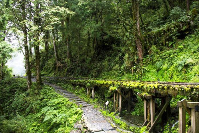 其實宜蘭太平山最有名的是見晴登山步道,昔日是運送木材的鐵道,因此整條登山步道保留了鐵軌,只將中間鋪滿石子方便行走,加上自然生態更造就了「覆滿青苔的舊鐵軌」。