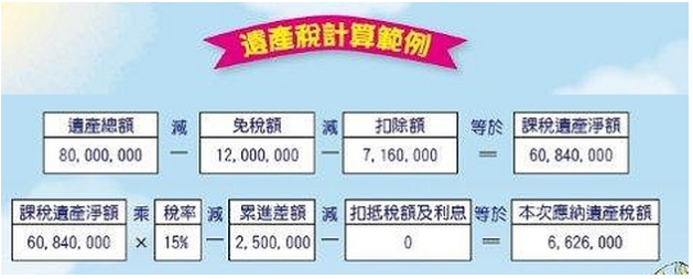 舉例大白在2017年12月3日死亡,遺產總額8000萬元、免稅額1200萬元,可扣除額716萬元,大白應繳的遺產稅額計算為8000萬-1200萬-716萬=6084萬元(課稅遺產淨額),接著再透過稅率計算出繳納的遺產稅額,即(6084萬X15%)-250萬=662.6萬元,所以大白應繳662.6萬元的遺產稅。
