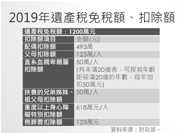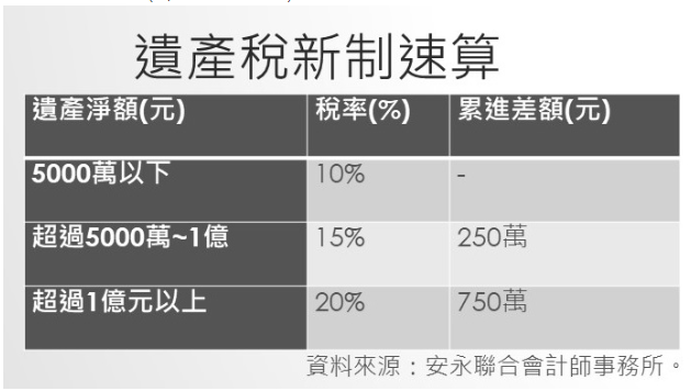 他進一步說明,若被繼承人遺產總額超過1億元以上,可能會用到最高20%的稅率,若生存配偶主張該權利,可將一半金額的財產列為扣除額,將有機會適用比20%更低的稅率。