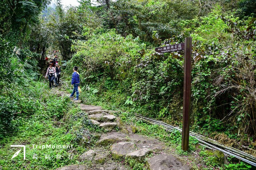 從楓樹湖站牌沿著往農村再生園區的方向上行,沒多久就能看到往楓樹湖古道的路標。