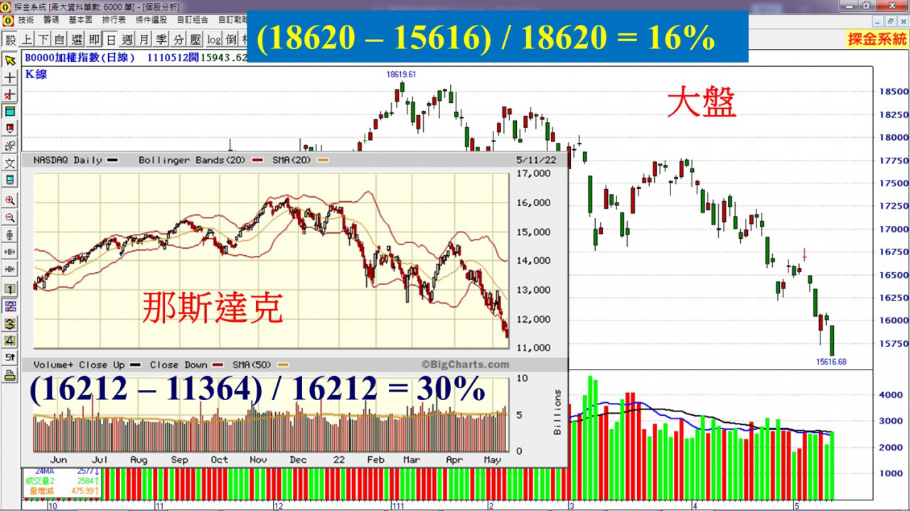 為何說台股接著要開始進行補跌效應?看看下面走勢圖,自高點下跌至5/12,那斯達克下跌30%,已經進入長空架構。台股本來在嚴重超漲之下開始下跌,自高點下跌了16%,如下圖。相較那斯達克,預期台股將補跌。5/12周三台股跌幅擴大,就已顯示出現補跌效應。這補跌效應的主要動力來源,來自於法人的停損賣單。