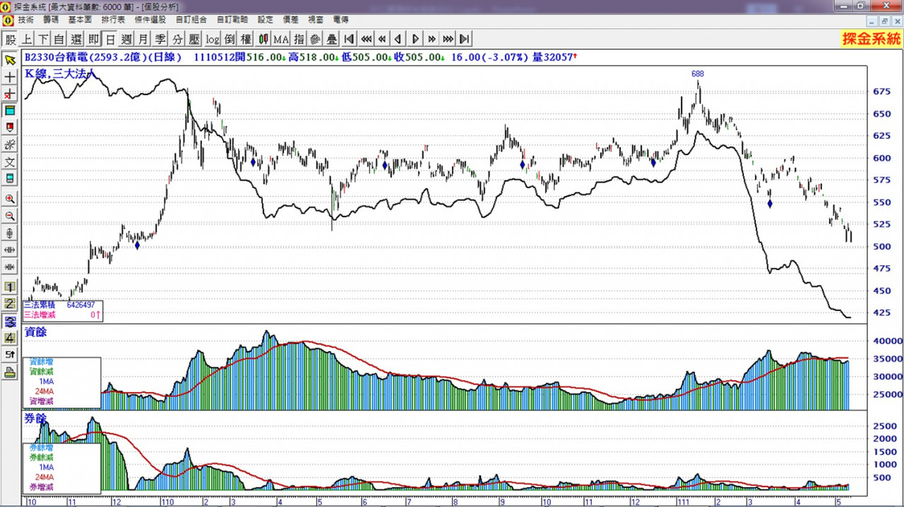 就型態來看,台積電的大頭形成了。若是跌破500元大關,法人停損單會湧現,還有得跌。就籌碼變化來看,外資感謝政府護盤與天天喊護國神山,造就了散戶天天零股跟定期定額第一,這接走了外資出的貨。如下圖。融資高水位,法人庫存持續快速下降。台股若要補跌,就得靠台積電、貨櫃三雄、金融股與高價股。