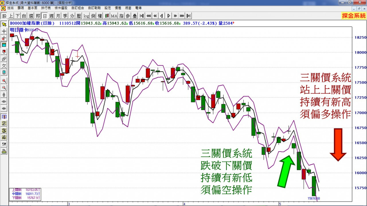 下圖為三關價日線圖。從台股三關價來看,5/6周五,收盤跌破下關價,續見新低,進行在偏空下跌。未來若再站上上關價,跌深反彈。