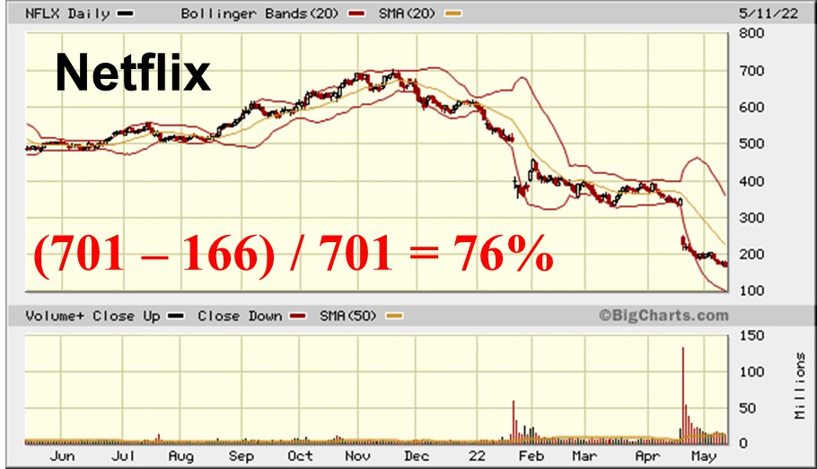 若是有仔細觀察美股就會發現,原本領漲的主流股尖牙股,已經變成領跌的空頭主流股。察看一下尖牙股中多麼離譜的Netflix,7個月從高點的701美元,跌到5/11日的166美元,跌幅76%,如下圖。
