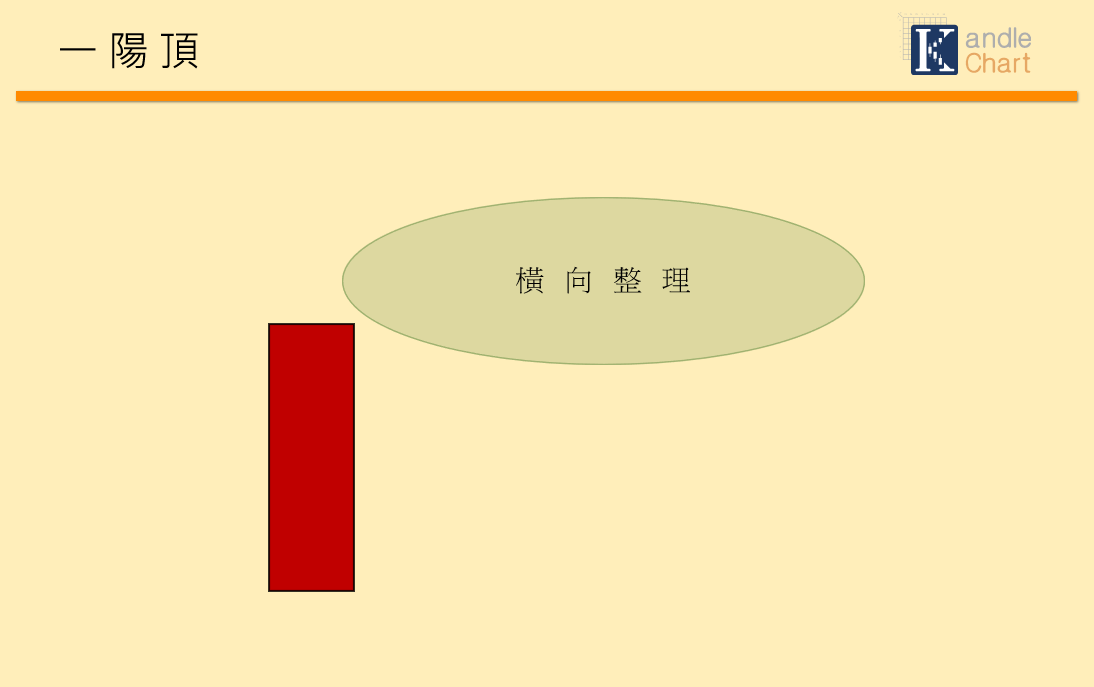 如上圖,出現大陽K後沒有立刻延伸續漲,走勢反而在大陽K收盤價附近橫向整理,這種走法稱為「一陽頂」。