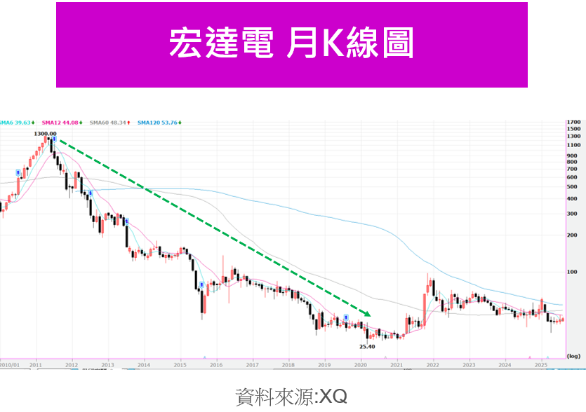 曾經在智慧型手機市場佔有一席之地,被視為與三星、iPhone同等級的競爭對手,在業績帶動下攻上1300元天價,後因競爭激烈退出手機市場,股價最低出現25.4元,最高跌幅達98.05%,如附圖一。