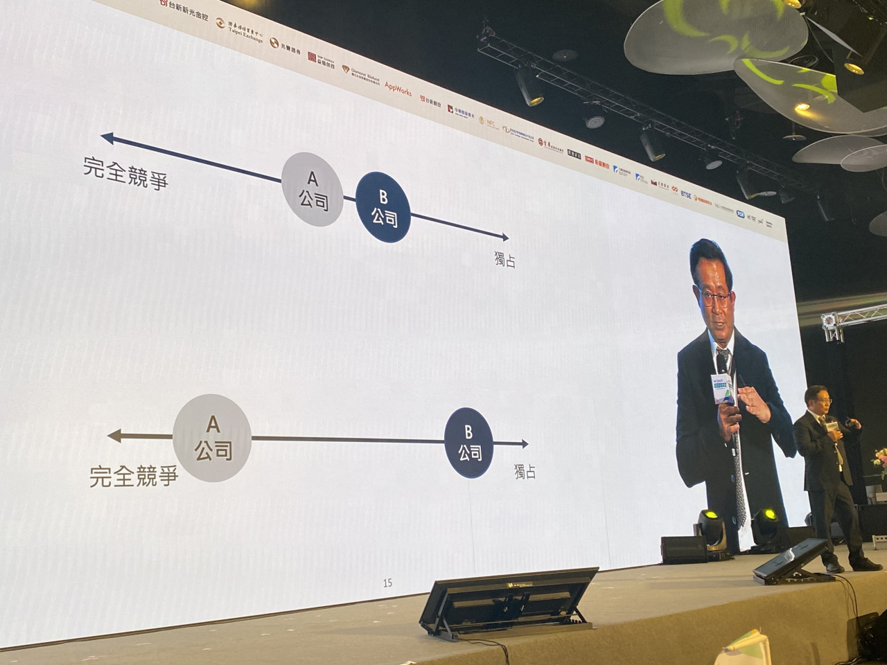他認為,在產業競爭的天平中,左邊是完全競爭,右邊是獨占,企業要追求的就是愈接近獨占愈好,但獨占很難,因此,企業要追求寡占的地位,才能在產業競賽中領先群倫。(見下圖二,林宏文攝影)