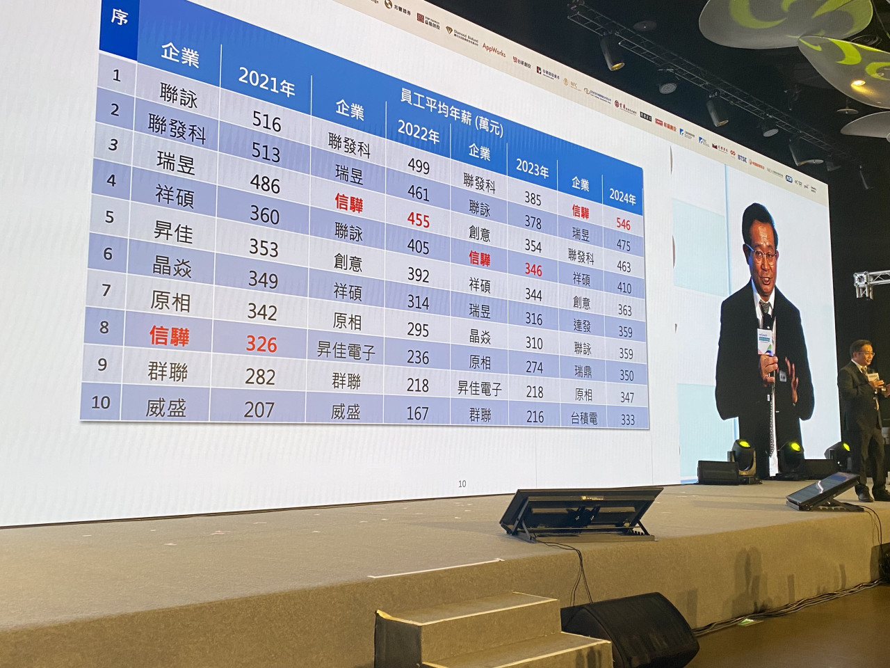 他也秀出信驊與其他同業對比的員工平均年薪,信驊2024年給每位員工的平均年薪是546萬元,高居國內第一名。他說,信驊每個員工平均可以貢獻5、6千萬元的營收,因此,不會吝惜給員工高薪,給員工薪水更多,公司就賺更多。(見下圖三,林宏文攝影)