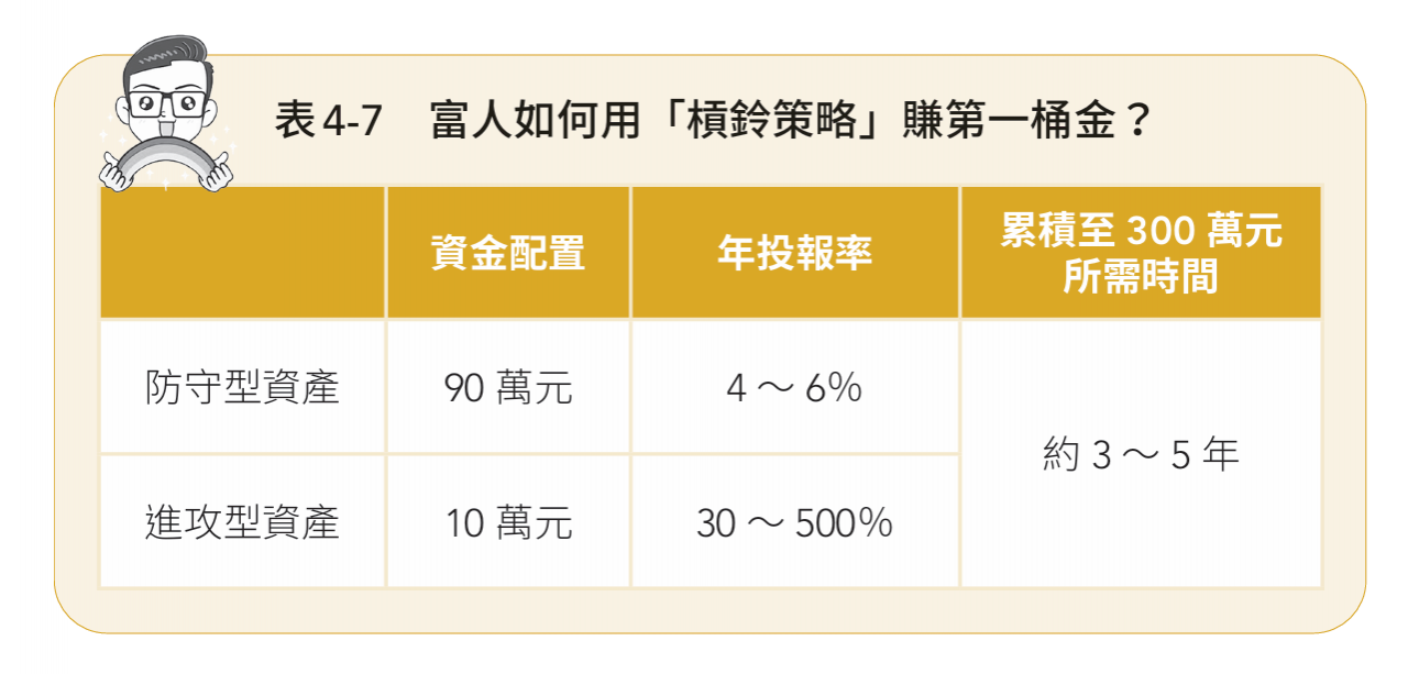 事實上「槓鈴策略」的精隨,即在於如何運營10%的「進攻型資產」。這部分的資產並不是「買了就放著等漲」,而是需要學習正確的進攻方法,才能比一般投資者更快賺到第一桶金,甚至更高的目標。