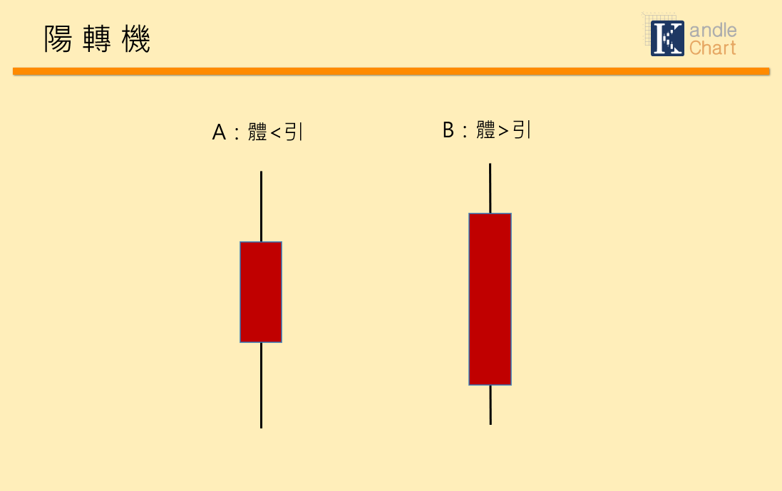 如上圖,自開盤開始賣壓湧現將價位往下壓低,跌至低價續跌無力買氣湧進將價位反轉往上推升,突破開盤價後買氣旺盛將價位持續向上推升,漲至高價續漲無力賣壓湧進將價位往下壓低,但賣壓已無法再次將價位跌破開盤價,最終收盤時收高於開盤價,且留有上下引線,這種K線型態稱為「陽轉機」。