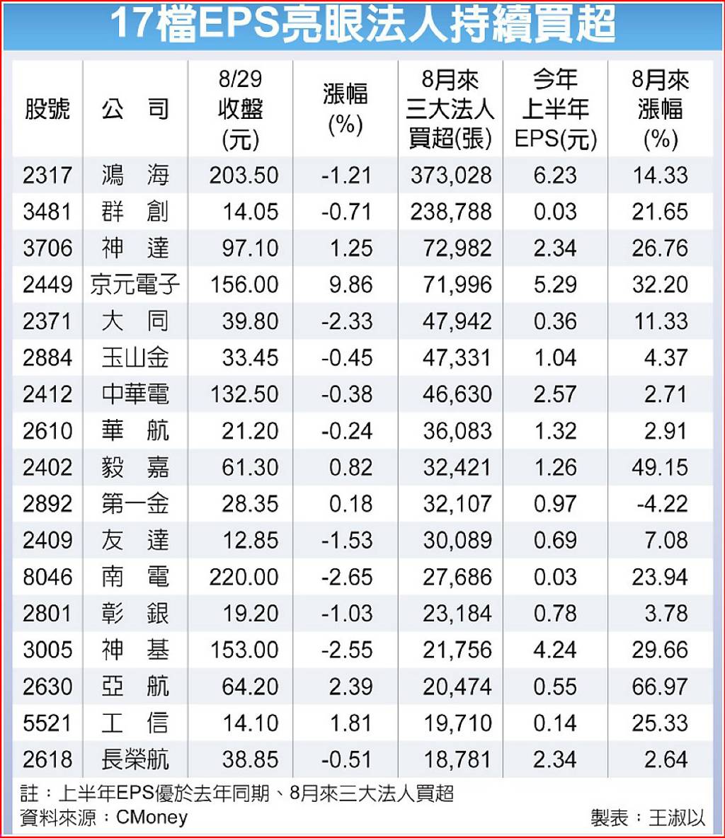 三大法人買超張數第一名的鴻海,逐步擺脫蘋果代工傳統窠臼形象,集團全力推動向機器人轉型及布局AI伺服器,從純代工到高毛利產業的轉型之路,獲三大法人認同。鴻海上半年EPS達6.23元,比去年同期的4.12元更佳,8月來三大法人買超37.3萬張,股價本月漲幅達14.33%。京元電上半年EPS達5.29元,29日股價攻漲停、收156元,創新高,三大法人8月買超7.2萬張,單月漲幅32.2%。