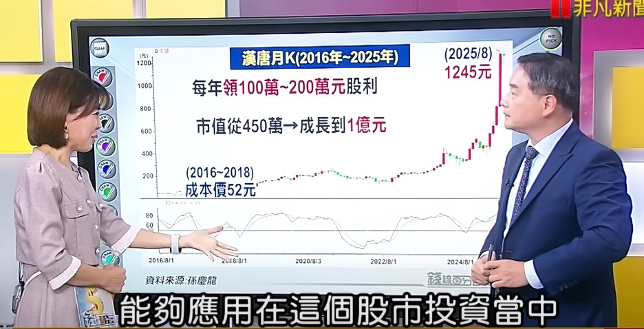 然而,人性的弱點往往在獲利時出現。孫慶龍坦言,漢唐股價漲到一兩百元時,他就已經全部賣光了,雖然賺了將近1,000萬元,但如果他能和學生一樣,一路抱到今年高點1,245元,這原本450萬元的投資,市值將會暴漲到1億元!更別提抱股期間,每年還能領到100到200萬元的現金股利,算下來殖利率幾乎高達50%!