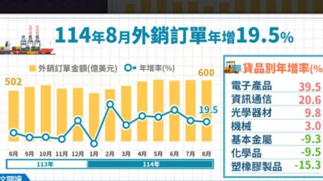 在人工智慧、高效能運算與雲端產業需求持續推升下,經濟部統計處今 (23) 日公布,台灣 8 月外銷訂單達 600.2 億美元,年增 19.5%,創下今年單月第二高紀錄,且是自今年二月以來連七個月的雙位數成長。