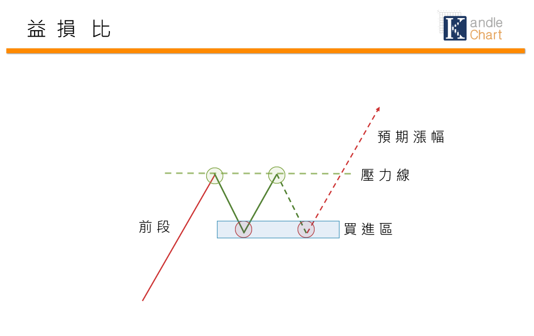 因為前次回跌的過程中,於藍色框線附近引進買氣,產生轉折向上延伸,當回跌至此區域就有機會再次引進買氣,如果買進後跌破藍色框線下緣表示先前的預想情狀已然消失,便可以停損離場,若買氣強勁就有機會延伸前段同等幅度的漲幅,即紅色虛線所示之幅度,紅色虛線明顯遠遠大於藍色框線之高低幅度,表示益損比非常高,用小虧損換取一個賺到大利潤的機會,非常划算,縱然遇到綠色虛線之壓力線突破不了,仍有利潤可圖,因而藍框處是一個絕佳的買進區間。