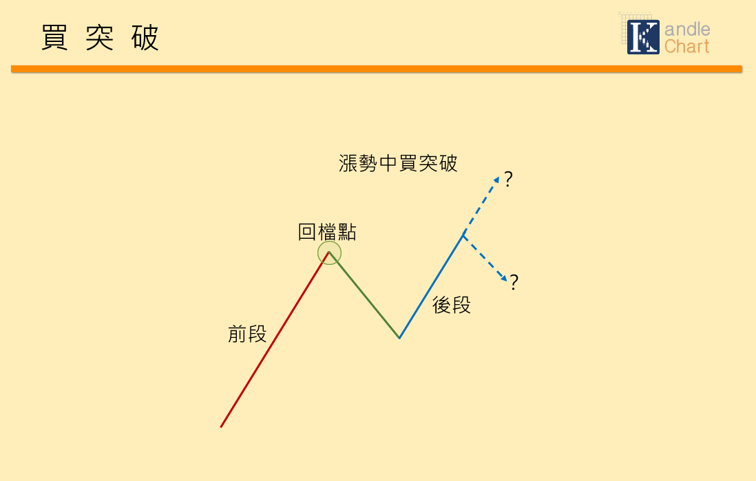 如果前段剛脫離整理區,趨勢剛由整理勢轉為漲勢,可以預期後段延伸續漲的機會比較大;反之,如果漲勢已經持續一段不小的時間,已經延伸出好幾個上漲段,那麼縱然反轉回檔點被突破且沒有壓力,買進時仍要很小心,如果沒有順利延伸成功,有時候反而是在作「噴出」的走勢,是整個漲勢趨勢要結束的訊號。