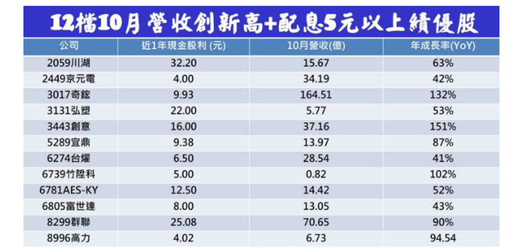 從10月公布的營收當中,高憲容篩選出12檔複製奇鋐模式,兼具成長及存股價值的績優股,條件包含10月營收創新高且年增率超過3成以上,今年配息超過4元的個股,包含川湖(2059)、京元電(2449)、弘塑(3131)、創意(3443)、宜鼎(5289)、台燿(6274)、竹陞科(6739)、AES-KY(6781)、富世達(6805)、群聯(8299)及高力(8996),作為選股備戰的名單。