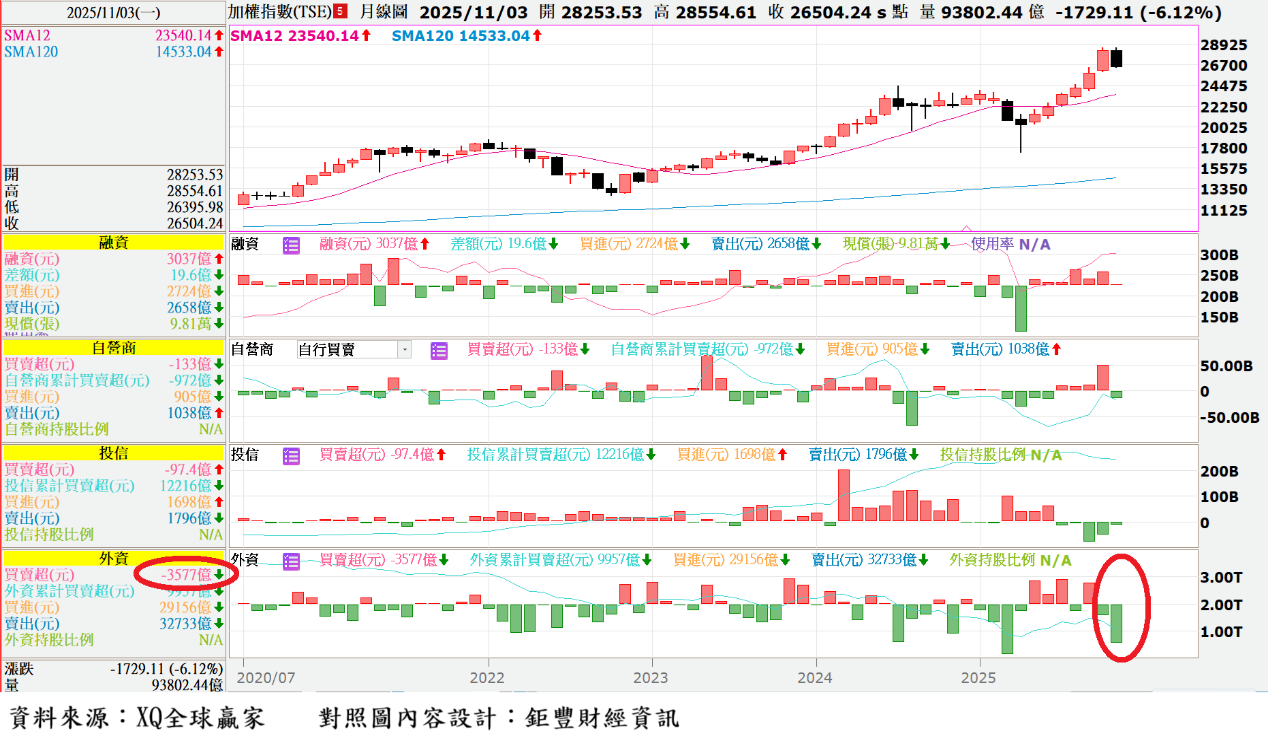 11月截至21日,外資加大賣超台股上市股票至3577億元,單月僅次於3月的賣超4656億元,為2025年以來單月第二大賣超月份,3月台股指數下跌10.23%,11月至24日止,台股指數下跌6.12%,台股持續拉回的危機依舊尚未解除。