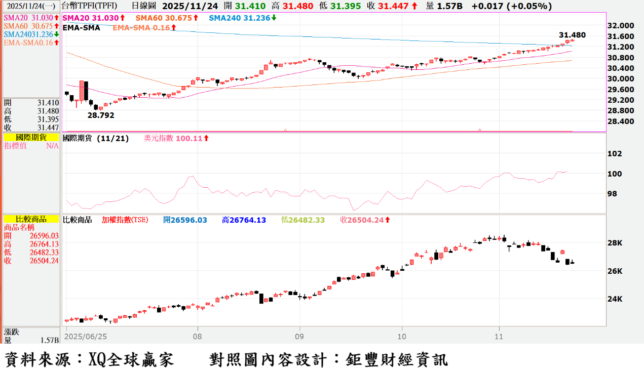 11月外資擴大賣超台股,台幣匯率截至24日,單月回貶2.27%,呈現股匯雙跌走勢,美元指數則回升至100以上,顯示外資11月賣超台股後,可能將部分資金匯出,並在美元資產尋求避險與停泊。在此情勢未改變前,台股暫難脫離拉回整理走勢。