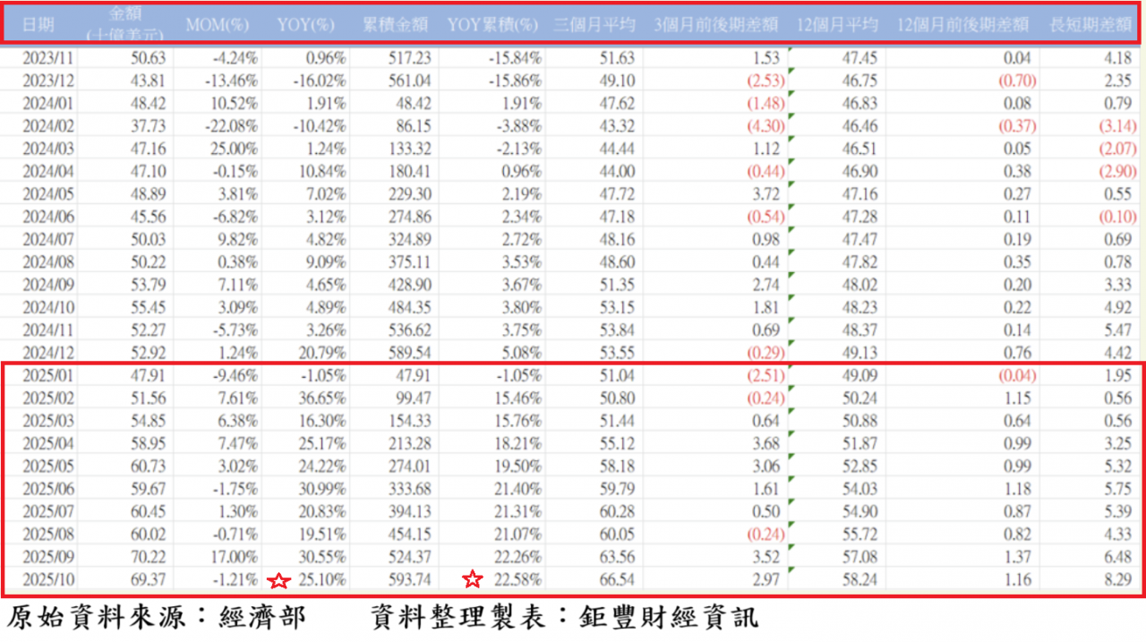 我國2025年10月外銷接單693.7億美元,創歷年同月新高,單月史上第二高,月減1.21%、年增25.1%,累計2025年前10月外銷接單5937.4億美元,年增22.58%,外銷接單呈現前所未見的榮景。