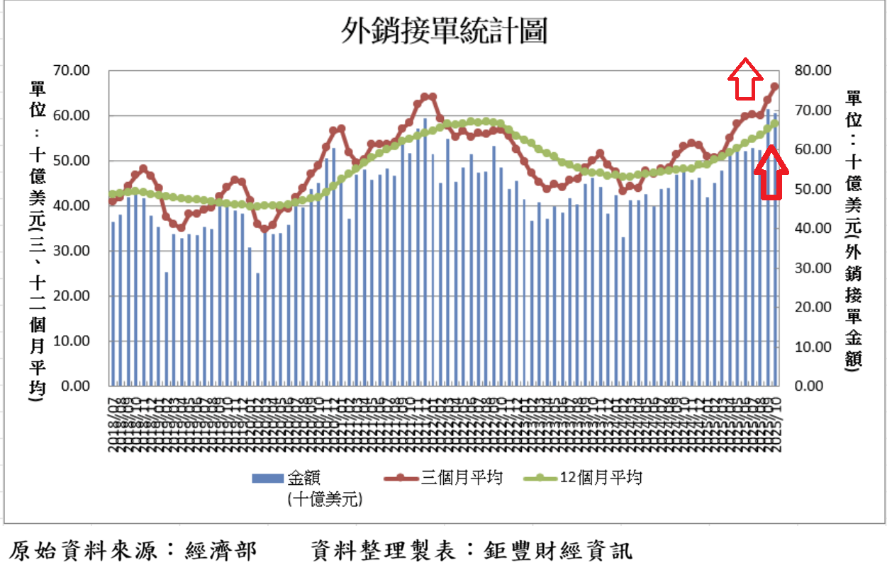 截至2025年10月,12個月平均外銷接單582.4億美元,較9月的12個月平均外銷接單金額上升11.6億美元,連續第9個月上升;3個月平均外銷接單665.4億美元,較9月上升29.7億美元,3個月平均外銷接單趨勢線於8月出現小幅下降,9月、10月的3個月平均外銷接單趨勢線連續轉上升,並連續第16個月高於12個月平均外銷接單的582.4億美元,顯示長期外銷接單趨勢持續呈現穩健成長上揚趨勢。