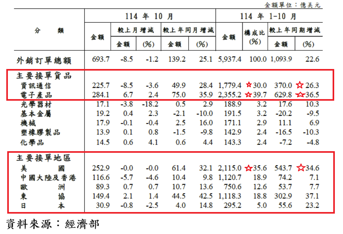 2025年10月電子產品外銷接單,年增35.9%,累計前10月年增36.5%;10月資訊通信產品外銷接單,年增28.4%,累計前10月年增26.3%。