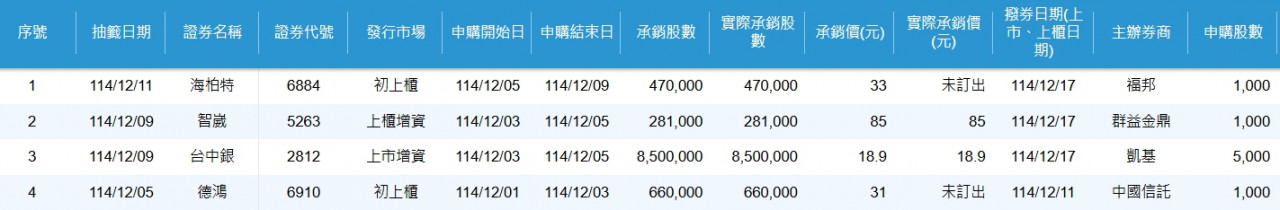 台股紅包又來了,根據證交所資訊,近期有4檔開放申購,分別是德鴻(6910)、台中銀(2812)、智崴(5263)、海柏特(6884),最先登場的是德鴻,公開申購至12/3截止,每股承銷價為31元,以前一日收盤價44.15元計算,幸運抽到的話潛在價差有1.3萬還算不錯。