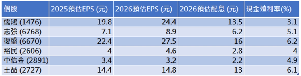 至於2026年最適合存股族標的是什麼呢?法人點名復盛應用(6670)連8年配逾100元,明年估可配16元,連鎖餐飲龍頭王品(2727)近2年配息逾14元、配息率約9成,明年可望配息13元,以前一日收盤價估算,現金殖利率都在6%以上。