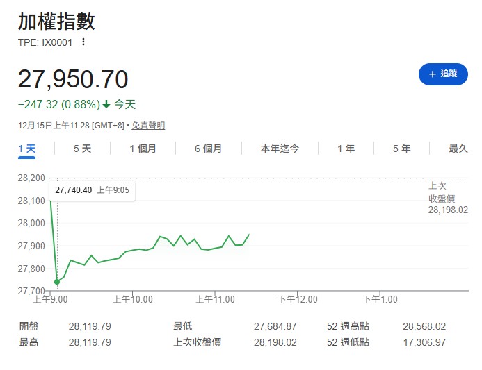 受美股科技股重挫拖累,台股周一(12/15)開盤即跌 78.23 點,以 28,119 點開出,隨後跌幅迅速擴大逾 500 點,盤中最低一度下探至 27,684 點,失守 2 萬 8 關卡。