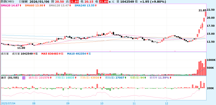 | 群創 (3481) | 21.85 | 0.73 | 資、券、當沖同增 | 各尺寸面板、FOPLP 半導體封裝 |
