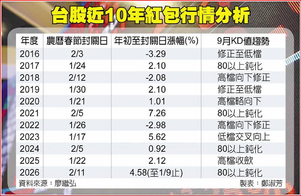 據統計,迄2025年止的過去10年紅包行情勝率達7成,最強的一年出現在2021年,期間漲幅達7.26%,展望新年度,康和證券投資總監廖繼弘表示,當9月KD值落在80以上、進入高檔鈍化,一般都有不錯的行情,2026年亦然,今年坐等紅包行情可期。