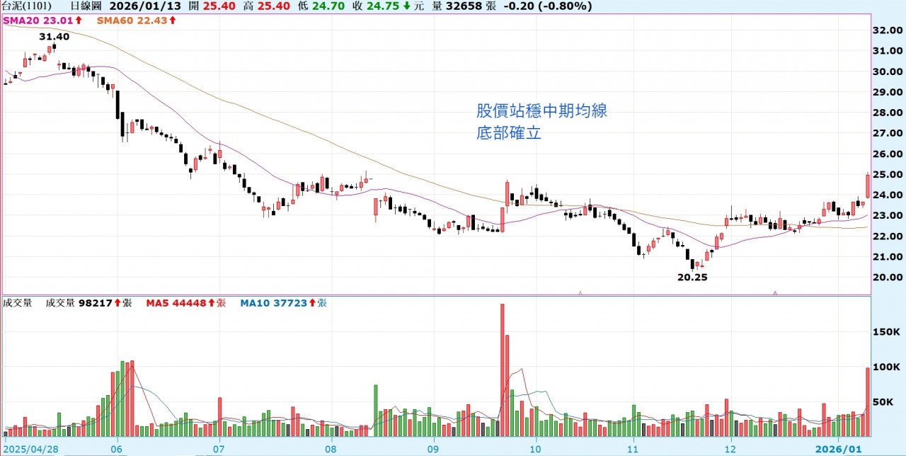 如果投資朋友仔細觀察台泥的股價走勢,可以發現股價在去(2025)年的11月19日落底之後,到周一(2026年1月12日)的收盤價,短短兩個月不到的時間,股價已經漲了24%。