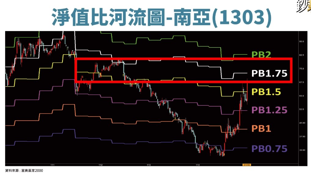 不過,股添樂也給出了警示。他觀察南亞的股價河流圖發現,雖然近期快速彈升,但1.75倍淨值比(約73元)將是關鍵天花板。