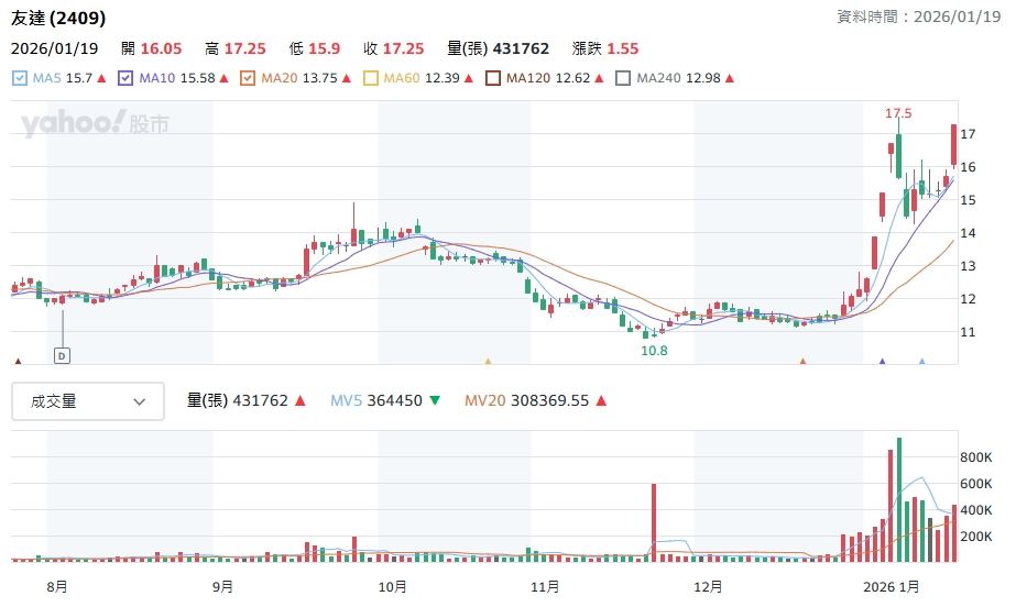 台股周一(1/19)開盤後一度跌逾百點,在台積電跌幅收斂以及記憶體、面板股帶動下,加權指數盤中翻紅。面板族群成為盤面吸睛焦點之一,友達(2409)攻上漲停,截至11時15分爆出43.3萬張大量,委買張數也來到5萬。