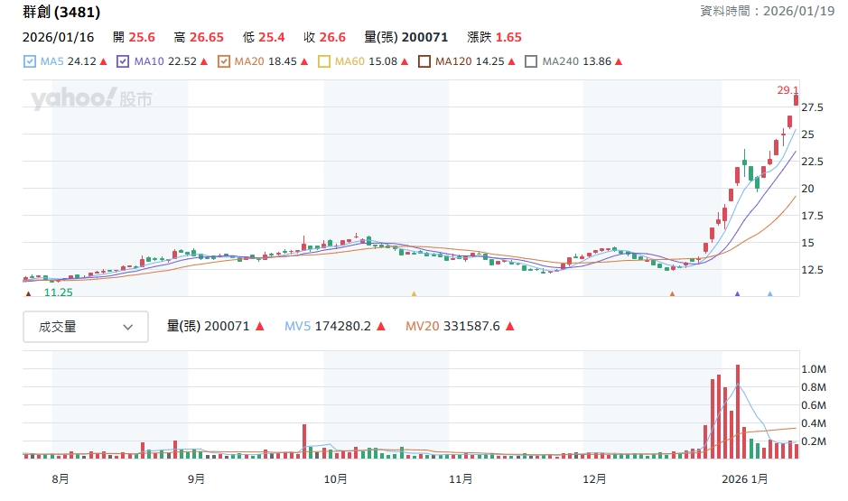 而群創由於市場傳出成功打入特斯拉執行長馬斯克馬斯克旗下SpaceX 火箭供應鏈,成為關鍵零組件供應商之一,激勵股價連日大漲。自1月7日列入處置股票,市場關注熱度依舊不減,周一同步帶量上攻,最高來到29.10元,市場也緊盯21日出關後是否「愈關愈大尾」。