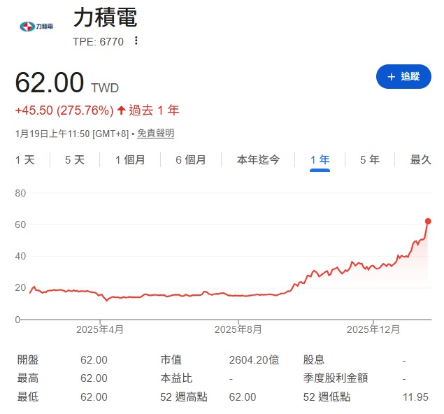 這股氣勢進入2026年後並未消散,股價持續走高,截至上周五(1/16)累計大漲逾四成,也使證交所在三個月內兩度將力積電票列為於「集中交易市場達公布注意交易資訊標準」,並於本月9~22日列為處置股。