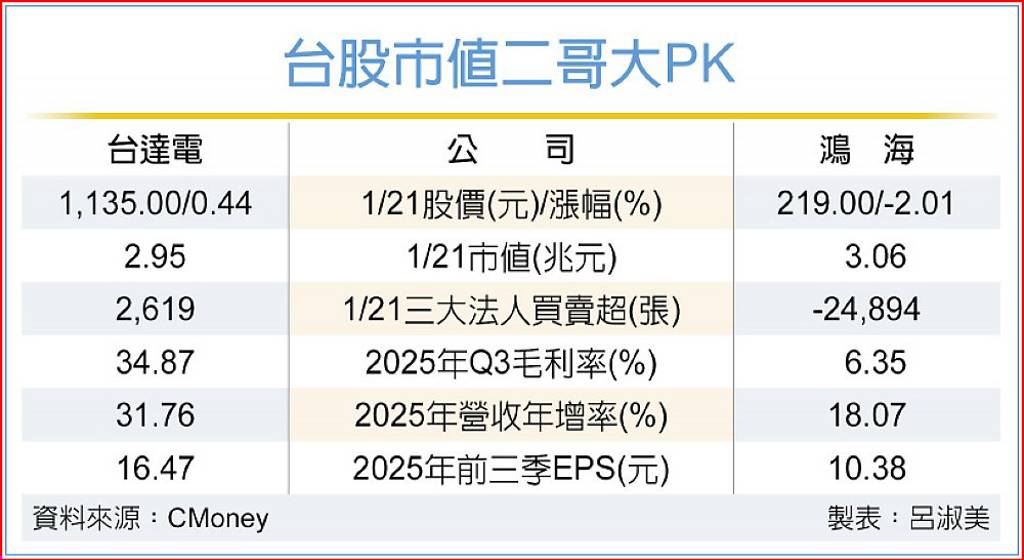 台達電近來獲得三大法人買盤青睞,推升股價重返千元大關後一路創高,21日再逆勢加碼2,619張,據統計,自2025年12月19日三大法人翻多後至今年1月20日止,共加碼逾2.9萬張;而鴻海21日遭三大法人賣出近2.49萬張,連三賣超將近8萬張。