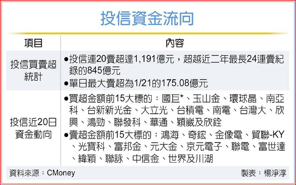 過去扮演台股多頭指標的投信,近期出現獲利小了結操作,截至1/23已連賣21天,減碼的標的包括不少盤面熱門股,顯示都找尋高檔容易套現的標的。