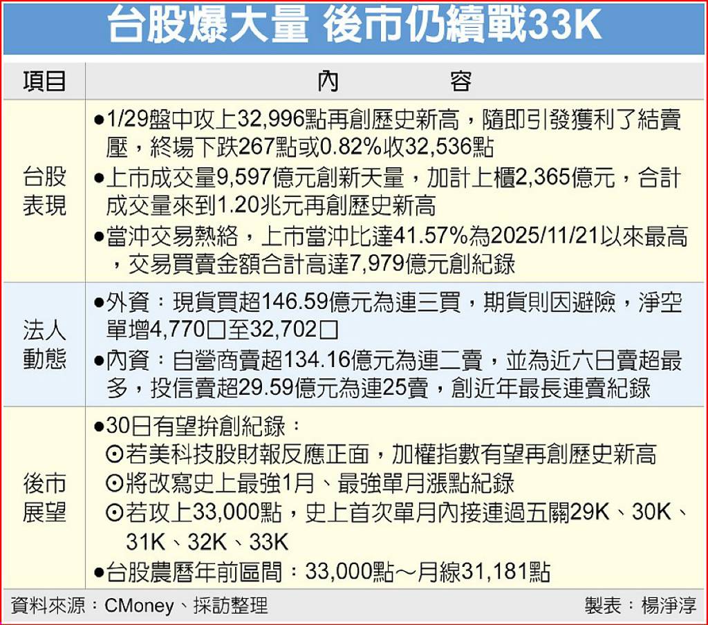 台股周四(1/29)開盤後最高大漲192點至32,996點再刷新高,隨即引獲利了結賣壓與搶買換手,加上當沖「沖沖樂」、沖出史上最大買賣量7,979億元,集中市場爆9,596億元史上最大量,加計櫃買市場合計總成交量為第八次突破兆元至1.2兆元,同寫歷史新高。