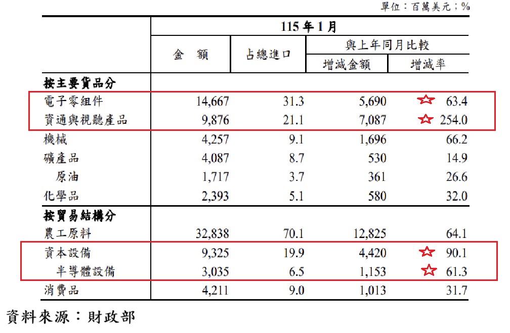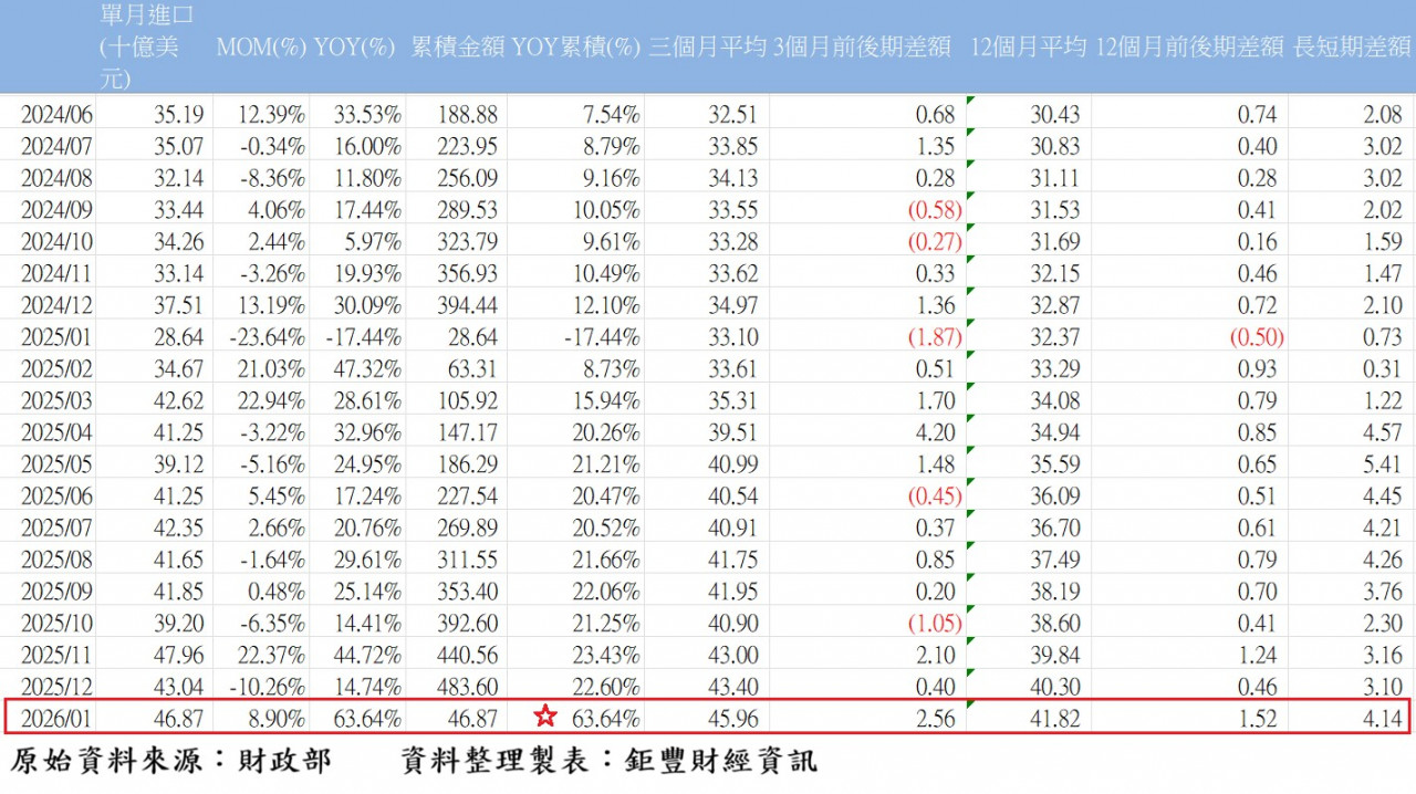 進口表現同樣值得正面解讀。1月進口規模居歷史次高,反映AI產業鏈國際分工持續深化,以及半導體與資通訊產業對資本設備與關鍵中間財的需求顯著增加。這類進口屬於投資導向與生產導向,並非內需疲弱下的被動增加,而是為支撐後續出口與產能擴張的必要投入,具有「出口前導指標」的意義。