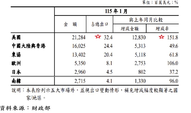 在市場別方面,1月對美國、歐洲、東協、日本及中國大陸與香港出口全面成長,其中對美出口年增達1.5倍,美國穩居台灣最大出口市場,顯示台灣出口重心正加速轉向以美國為核心的雲端與AI供應鏈。相較之下,對中國大陸與香港出口雖仍成長,但占比持續下滑,有助於降低單一市場與地緣政治風險,強化出口結構的韌性。