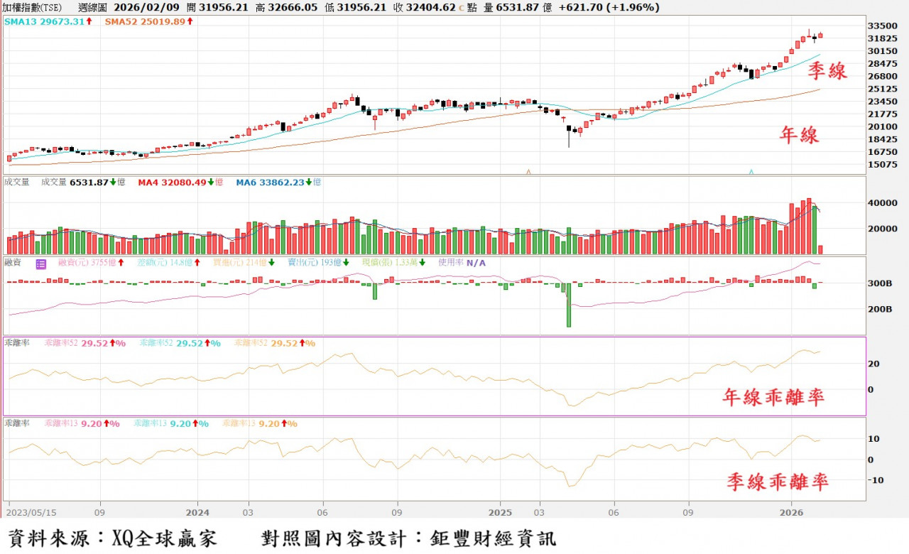 圖二、台股周K線與年線及季線乖離率(2026/2/9)