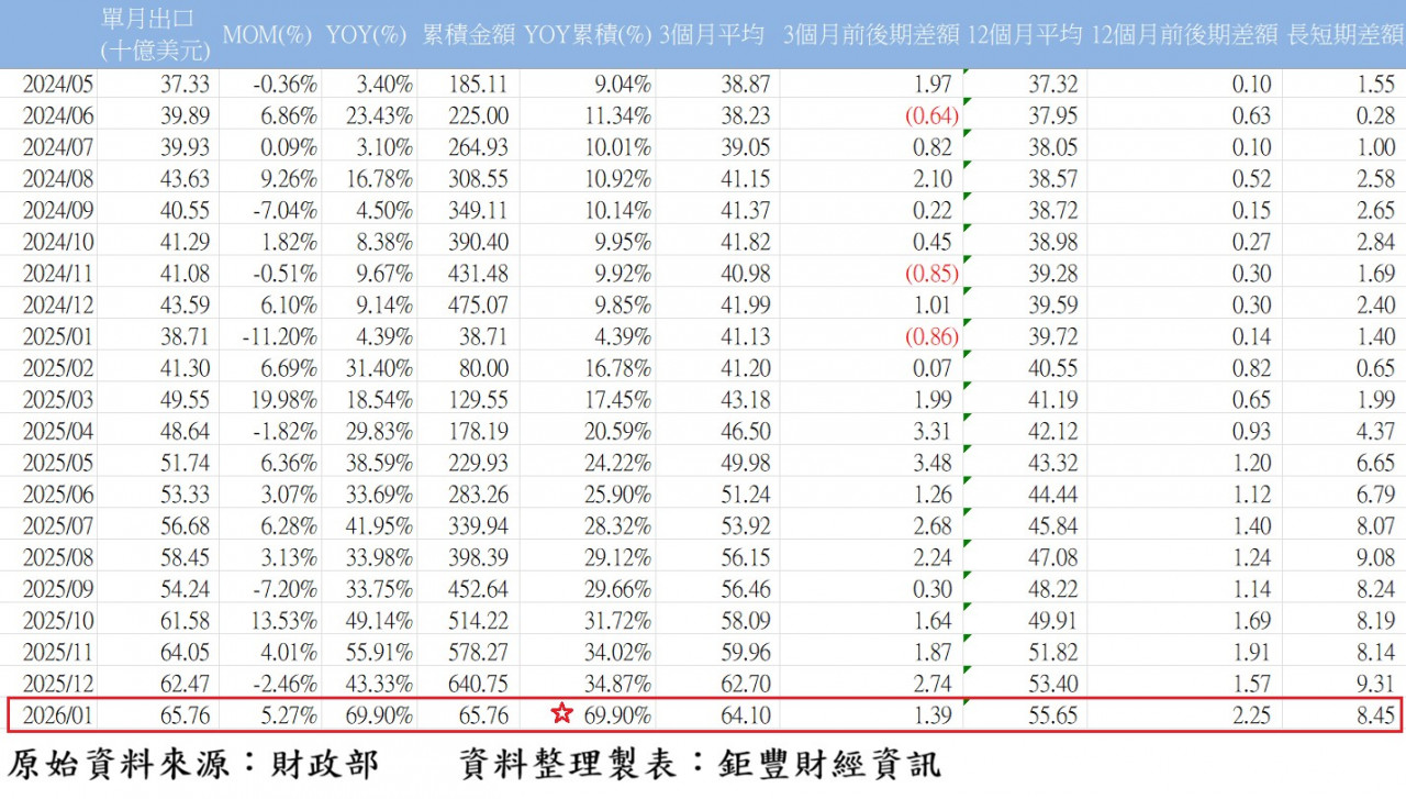 表一、台灣各月出口統計數(2024年5月至2026年1月)