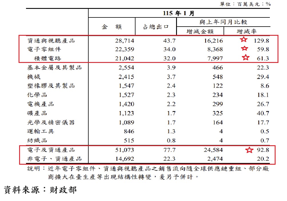 1月資通與視聽產品、電子零組件雙雙創下歷年單月新高,兩者合計貢獻總出口成長近九成,顯示台灣出口結構已高度集中於AI相關硬體與關鍵零組件,並逐步擺脫對消費性電子與短周期景氣的依賴。