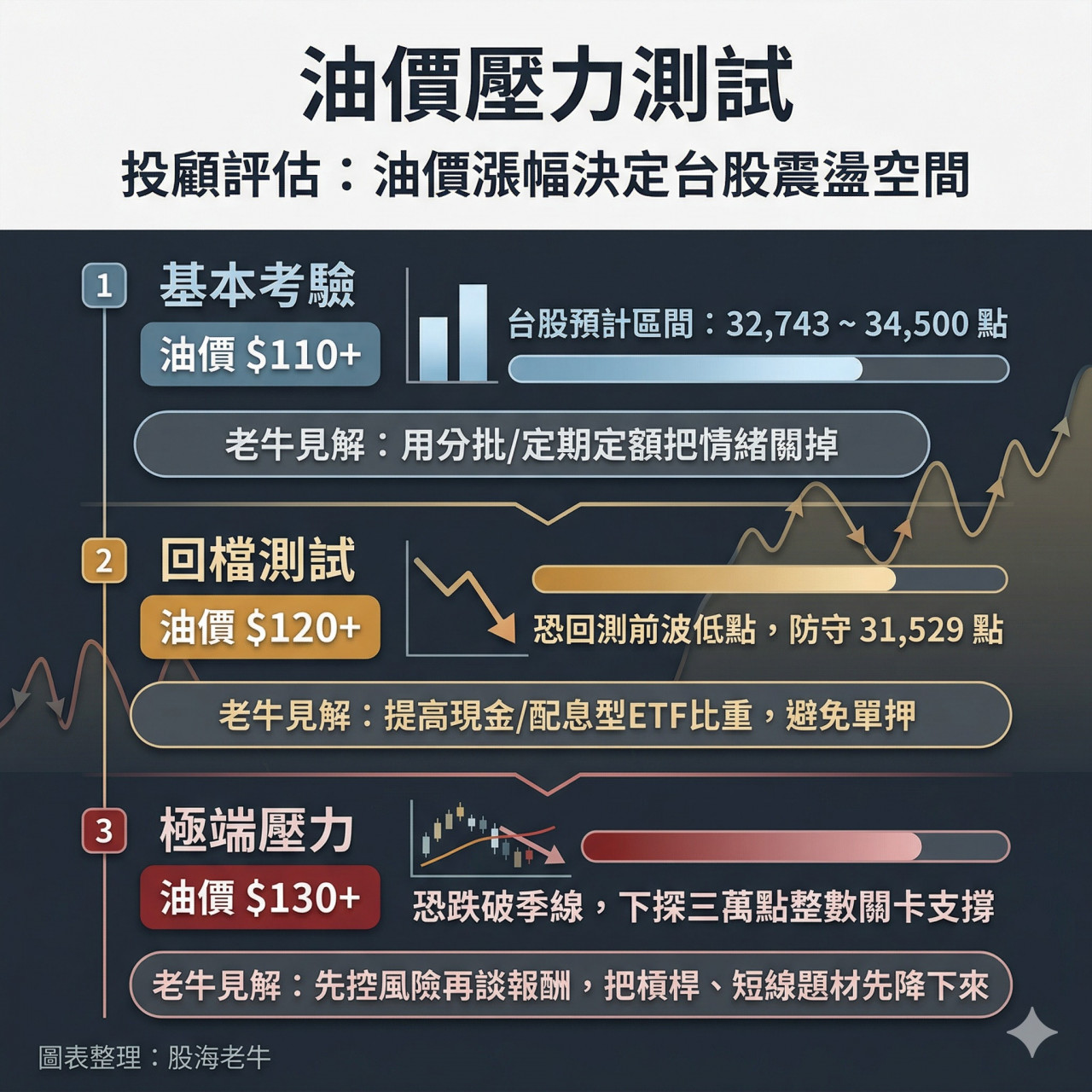 3.極端壓力 (油價 $130+):恐跌破季線,下探三萬點整數關卡支撐。(老牛見解:先控風險再談報酬,把槓桿、短線題材先降下來)