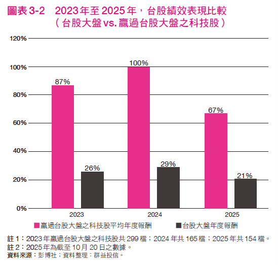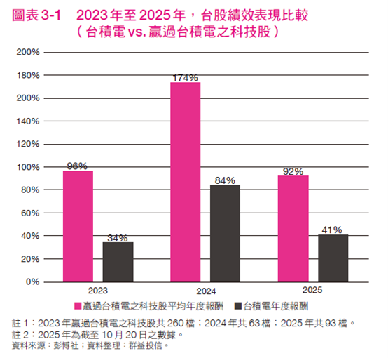 而2025年截至10月20日為止,投資報酬率優於大盤的有154檔,其中績效更勝台積電的科技股有93檔、平均年度報酬為92%,比台積電的年度報酬41%又是高出2倍多。