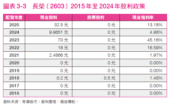 以圖表3-3 長榮(2603)的現金股利政策為例,2023 年時配發70 元, 現金殖利率高達45.16%,但2021 年時只配息約2.5 元,現金殖利率不到2%,2016 年、2017 年、2019 年及2020 年更是完全不配息,現金殖利率是0%,這就是偶一為之,而非穩扎穩打的好體質,也因此長榮就不會是存股的合格標的。